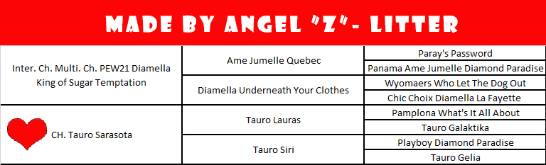 Made by Angel “Z” litter is one HUGE litter with 6 boys and 1 girl in it! Brave mama, Tauro Sarasota born them on 26 of January 2026! Proud daddy is our beloved stud Diamella King of Sugar Temptation. Both parents are champions, King is International Champion, and he was best puppy of Europe in 2021! We have a lot expectations from this litter! If you are interested in getting a dog from this litter, you can feel free to send message on +38163294234 trough Viber or What’s Up or you can E-mail me on: milos-kuzmanovic@hotmail.com